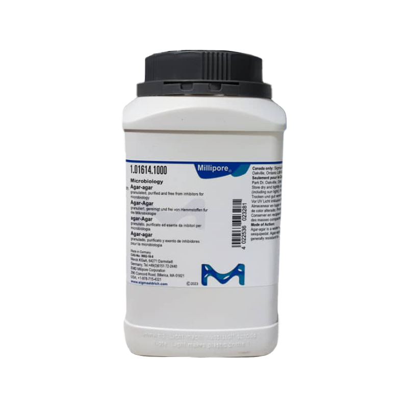 آگار (Agar) یک پلی‌ساکارید طبیعی است که از جلبک‌های دریایی گرفته می‌شود و به‌صورت جامد گرانوله یا پودری عرضه می‌گردد. در محصول کد 101614 از برند Sigma / Merck، آگار به‌صورت گرانوله، تصفیه‌شده و بدون مهارکننده‌ها تولید شده تا برای کاربردهای میکروبیولوژی (Microbiology) مناسب باشد. این نوع آگار به دلیل خلوص بالاتر و عدم وجود مواد مضر برای رشد میکروارگانیسم‌ها، انتخاب ایده‌آلی برای محیط کشت آزمایشگاهی به شمار می‌آید.